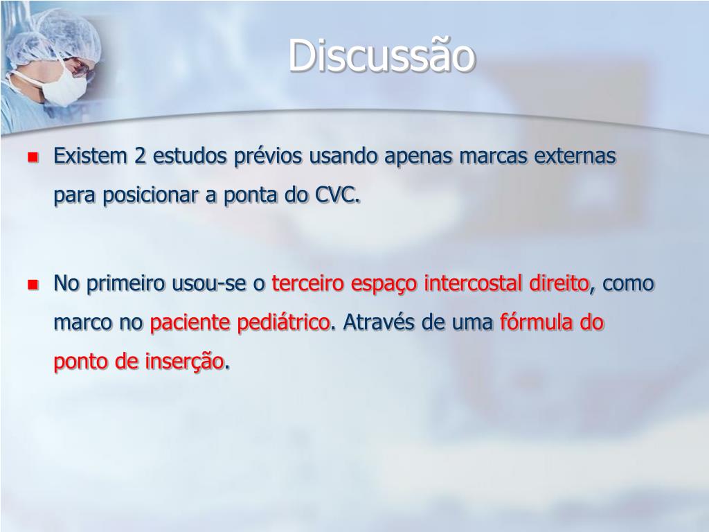 Discussão • Existem 2 estudos prévios usando apenas marcas externas para posicionar a ponta do CVC. • No primeiro usou-se o terceiro espaço intercostal direito, como marco no paciente pediátrico. Através de uma fórmula do ponto de inserção.
