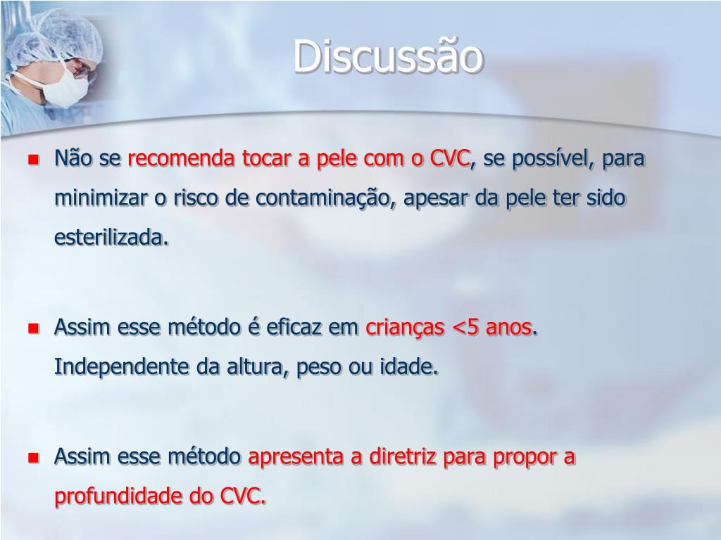 Discussão • Não se recomenda tocar a pele com o CVC, se possível, para minimizar o risco de contaminação, apesar da pele ter sido esterilizada. • Assim esse método é eficaz em crianças <5 anos. Independente da altura, peso ou idade. • Assim esse método apresenta a diretriz para propor a profundidade do CVC.