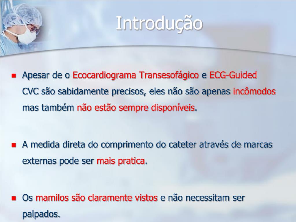 Introdução • Apesar de o Ecocardiograma Transesofágico e ECG-Guided CVC são sabidamente precisos, eles não são apenas incômodos mas também não estão sempre disponíveis. • A medida direta do comprimento do cateter através de marcas externas pode ser mais pratica. • Os mamilos são claramente vistos e não necessitam ser palpados.