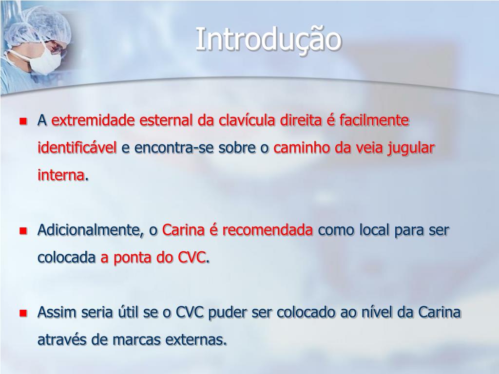 Introdução • A extremidade esternal da clavícula direita é facilmente identificável e encontra-se sobre o caminho da veia jugular interna. • Adicionalmente, o Carina é recomendada como local para ser colocada a ponta do CVC. • Assim seria útil se o CVC puder ser colocado ao nível da Carina através de marcas externas.