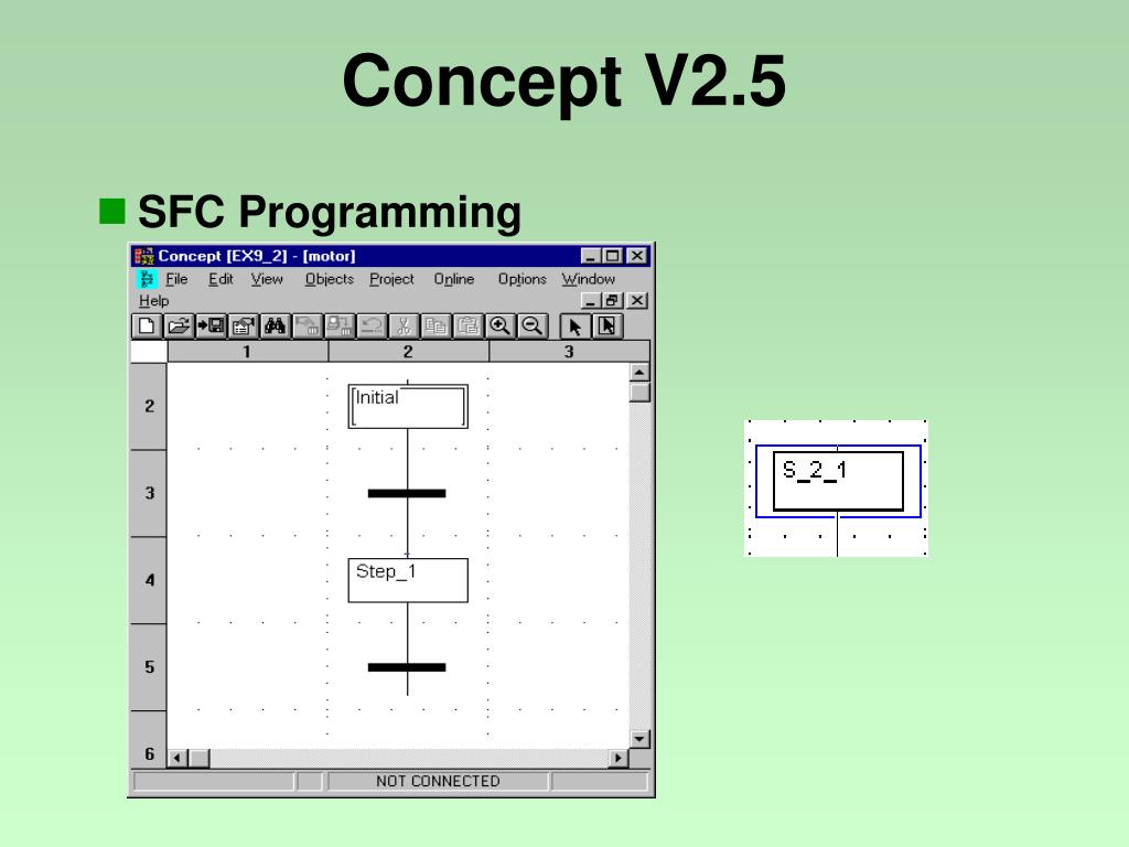 Concept V2.5 • SFC - Elements: The Step • Step types are the initial step or steps. • A step becomes active when the prior transition has been satisfied • A step becomes inactive when the succeeding transition has been satisfied AND the step delay time has elapsed. • None, one or multiple actions, with qualifiers, can be declared for each step. • A supervision time can be defined for each step.