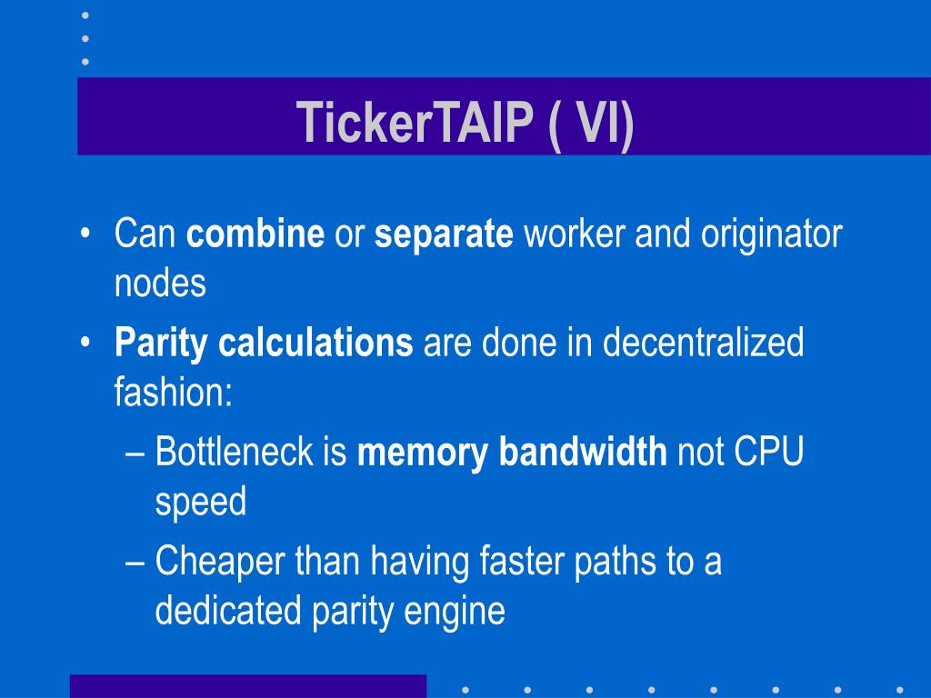 TickerTAIP ( VI) • Can combine or separate worker and originator nodes • Parity calculations are done in decentralized fashion: • Bottleneck is memory bandwidth not CPU speed • Cheaper than having faster paths to a dedicated parity engine