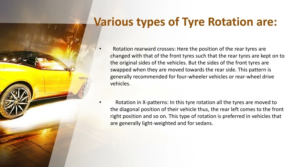 Various types of Tyre Rotation are: • Rotation rearward crosses: Here the position of the rear tyres are changed with that of the front tyres such that the rear tyres are kept on to the original sides of the vehicles. But the sides of the front tyres are swapped when they are moved towards the rear side. This pattern is generally recommended for four-wheeler vehicles or rear-wheel drive vehicles. • Rotation in X-patterns: In this tyre rotation all the tyres are moved to the diagonal position of their vehicle thus, the rear left comes to the front right position and so on. This type of rotation is preferred in vehicles that are generally light-weighted and for sedans.