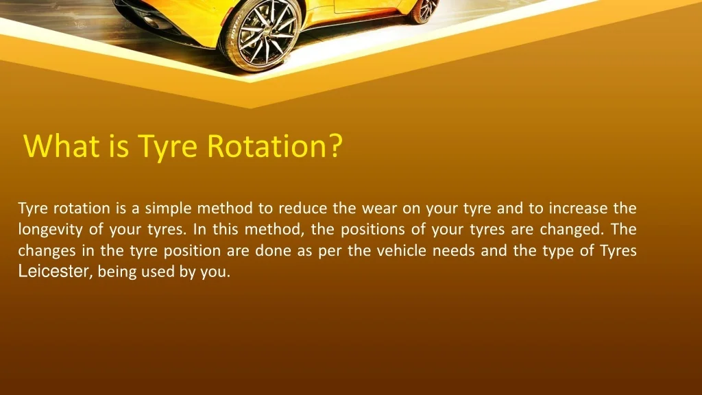 What is Tyre Rotation? Tyre rotation is a simple method to reduce the wear on your tyre and to increase the longevity of your tyres. In this method, the positions of your tyres are changed. The changes in the tyre position are done as per the vehicle needs and the type of TyresLeicester, being used by you.