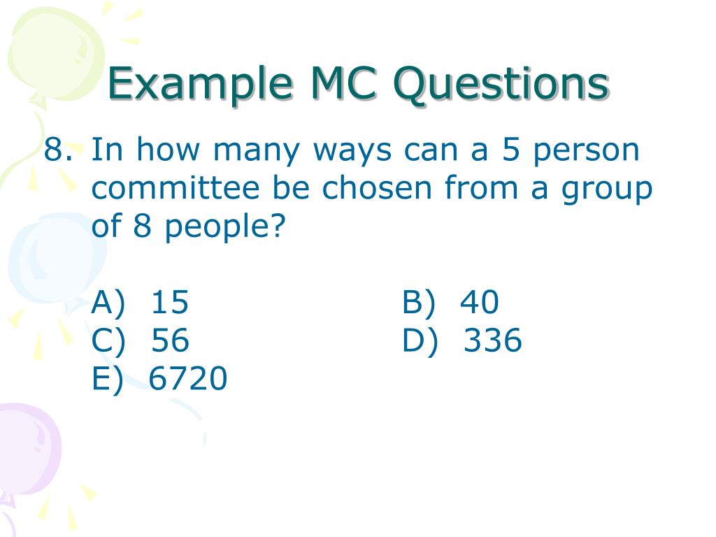 Example MC Questions • In how many ways can a 5 person committee be chosen from a group of 8 people?A) 15 B) 40C) 56 D) 336E) 6720
