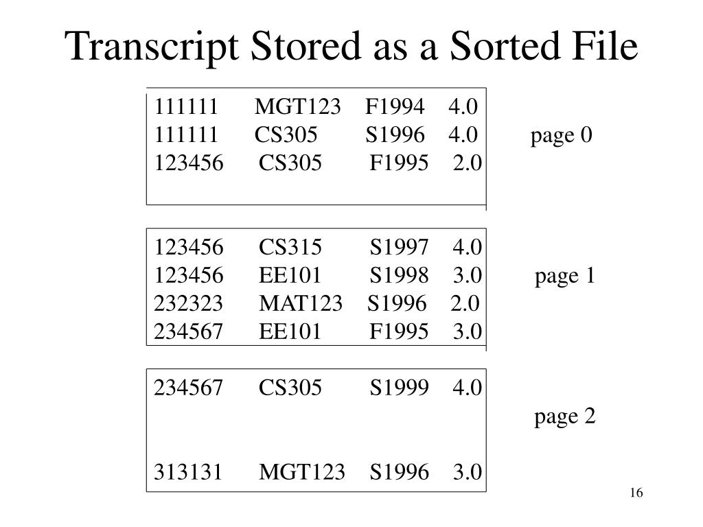 Transcript Stored as a Sorted File 111111 MGT123 F1994 4.0 111111 CS305 S1996 4.0 page 0 123456 CS305 F1995 2.0 123456 CS315 S1997 4.0 123456 EE101 S1998 3.0 page 1 232323 MAT123 S1996 2.0 234567 EE101 F1995 3.0 234567 CS305 S1999 4.0 page 2 313131 MGT123 S1996 3.0