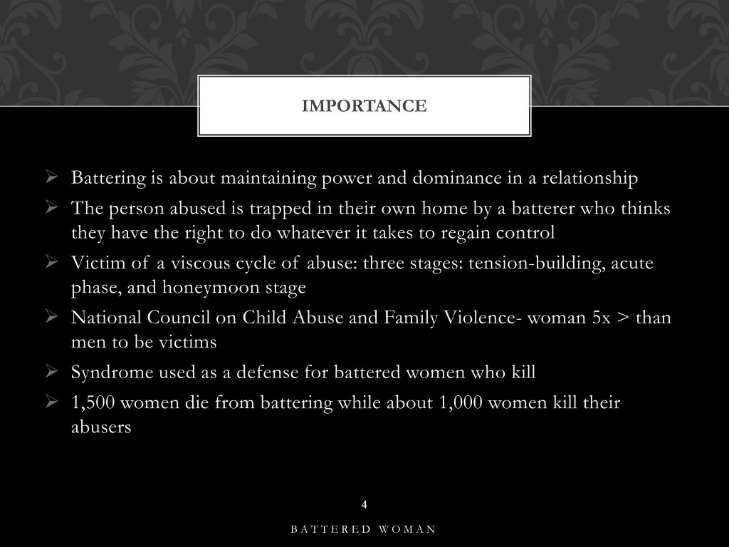 Importance • Battering is about maintaining power and dominance in a relationship • The person abused is trapped in their own home by a batterer who thinks they have the right to do whatever it takes to regain control • Victim of a viscous cycle of abuse: three stages: tension-building, acute phase, and honeymoon stage • National Council on Child Abuse and Family Violence- woman 5x > than mento be victims • Syndrome used as a defense for battered women who kill • 1,500 women die from battering while about 1,000 women kill their abusers battered woman