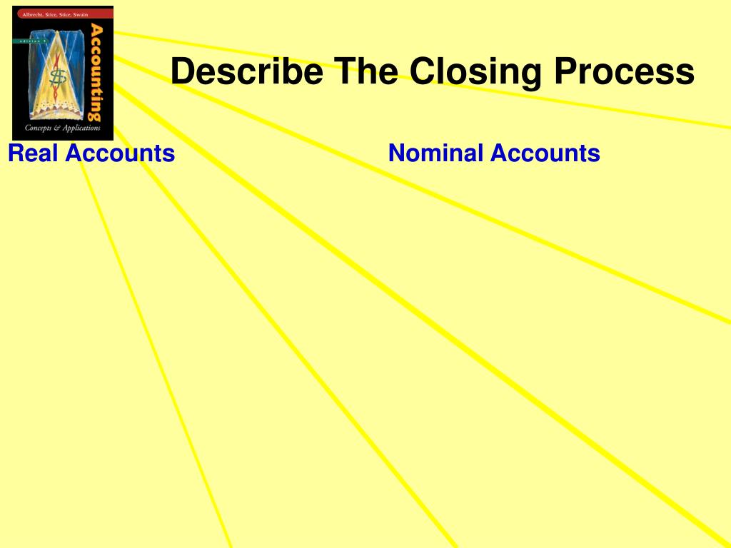 nominal or temporary accounts real (permanent) account Closing Entries Identify Nominal and Real Accounts Dec. 31 Sales Revenue. . . . . . . . . . . 1,500 Rent Revenue. . . . . . . . . . . . 100 Cost of Goods Sold . . . . . 1,100 Salaries Expense. . . . . . . 200 Other Expenses . . . . . . . . 150 Retained Earnings . . . . . . 150