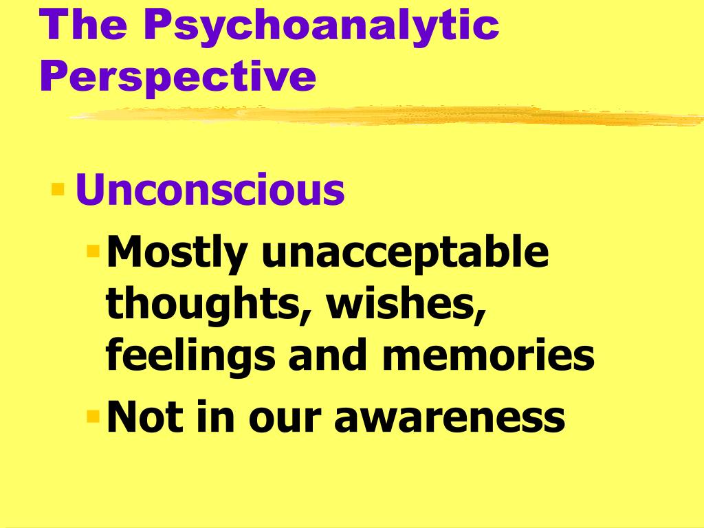 The Psychoanalytic Perspective • Unconscious • Mostly unacceptable thoughts, wishes, feelings and memories • Not in our awareness