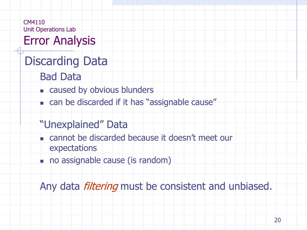 CM4110Unit Operations LabError Analysis Discarding Data Bad Data • caused by obvious blunders • can be discarded if it has “assignable cause” “Unexplained” Data • cannot be discarded because it doesn’t meet our expectations • no assignable cause (is random) Any data filtering must be consistent and unbiased.