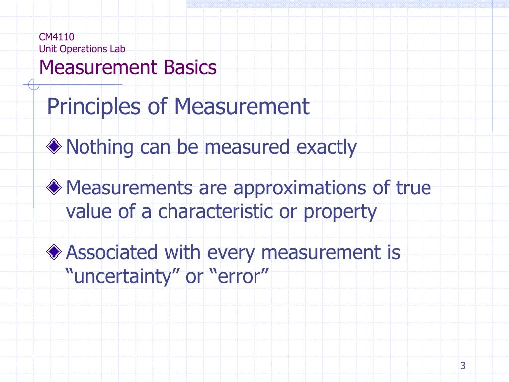 CM4110Unit Operations LabMeasurement Basics Principles of Measurement • Nothing can be measured exactly • Measurements are approximations of true value of a characteristic or property • Associated with every measurement is “uncertainty” or “error”