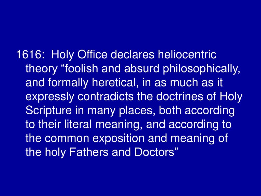 1616: Holy Office declares heliocentric theory “foolish and absurd philosophically, and formally heretical, in as much as it expressly contradicts the doctrines of Holy Scripture in many places, both according to their literal meaning, and according to the common exposition and meaning of the holy Fathers and Doctors”