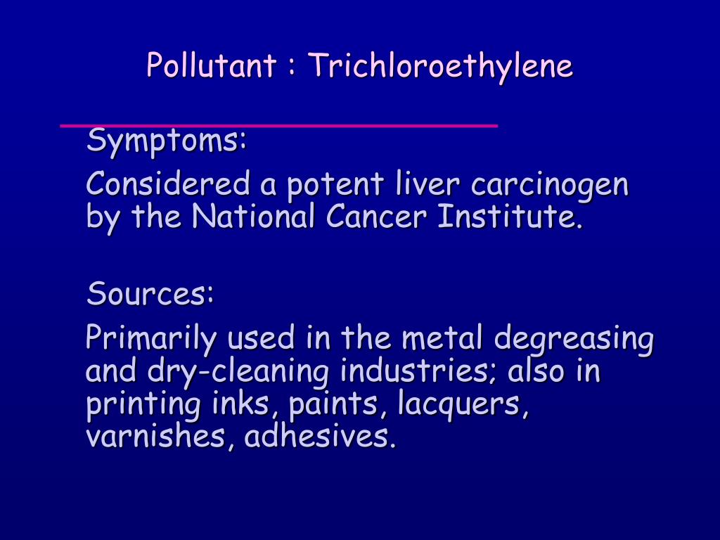 Pollutant : Trichloroethylene Symptoms: Considered a potent liver carcinogen by the National Cancer Institute. Sources: Primarily used in the metal degreasing and dry-cleaning industries; also in printing inks, paints, lacquers, varnishes, adhesives.