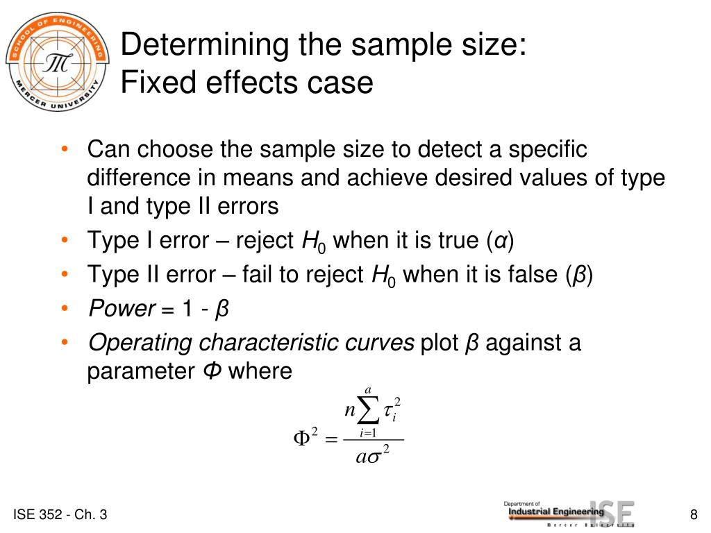 Determining the sample size:Fixed effects case Can choose the sample size to detect a specific difference in means and achieve desired values of type I and type II errors Type I error – reject H0 when it is true (α) Type II error – fail to reject H0 when it is false (β) Power = 1 - β Operating characteristic curves plot βagainst a parameter Φ where