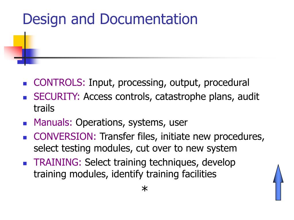 Design and Documentation • CONTROLS: Input, processing, output, procedural • SECURITY: Access controls, catastrophe plans, audit trails • Manuals: Operations, systems, user • CONVERSION: Transfer files, initiate new procedures, select testing modules, cut over to new system • TRAINING: Select training techniques, develop training modules, identify training facilities *