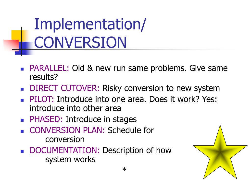 Implementation/CONVERSION • PARALLEL:Old & new run same problems. Give same results? • DIRECT CUTOVER:Risky conversion to new system • PILOT:Introduce into one area. Does it work? Yes: introduce into other area • PHASED:Introduce in stages • CONVERSION PLAN:Schedule for conversion • DOCUMENTATION:Description of how system works *