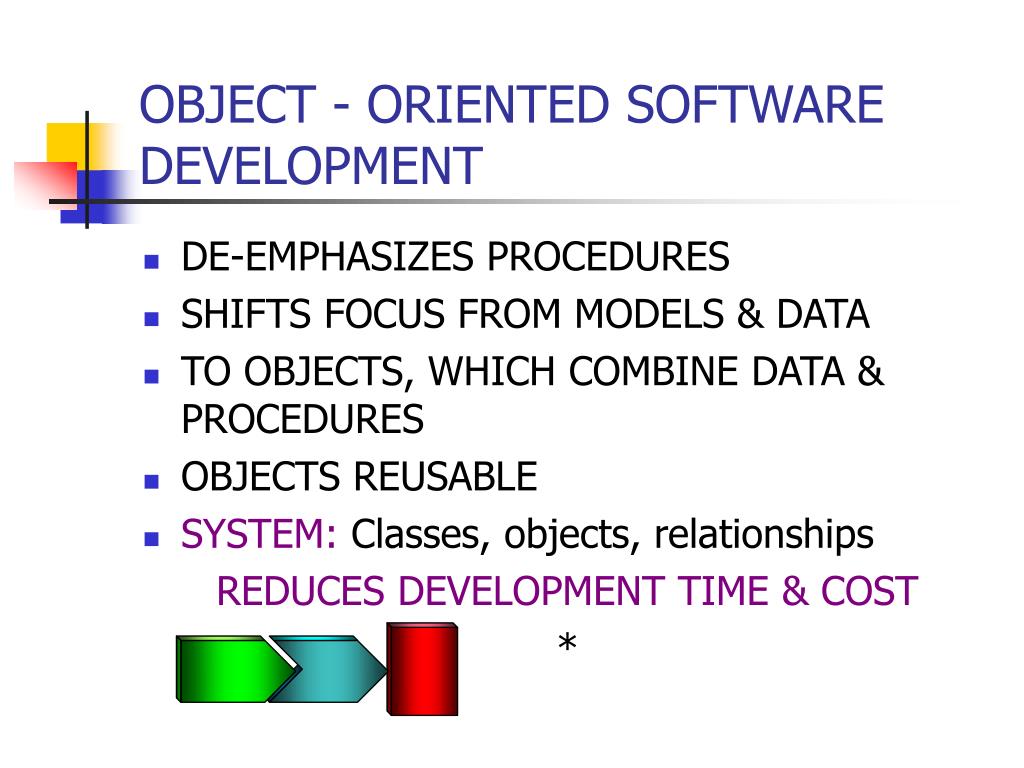 OBJECT - ORIENTED SOFTWARE DEVELOPMENT • DE-EMPHASIZES PROCEDURES • SHIFTS FOCUS FROM MODELS & DATA • TOOBJECTS, WHICH COMBINE DATA & PROCEDURES • OBJECTS REUSABLE • SYSTEM: Classes, objects, relationships REDUCES DEVELOPMENT TIME & COST *