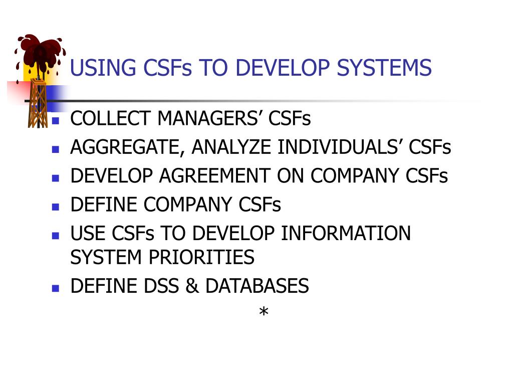 USING CSFs TO DEVELOP SYSTEMS • COLLECT MANAGERS’ CSFs • AGGREGATE, ANALYZE INDIVIDUALS’ CSFs • DEVELOP AGREEMENT ON COMPANY CSFs • DEFINE COMPANY CSFs • USE CSFs TO DEVELOP INFORMATION SYSTEM PRIORITIES • DEFINE DSS & DATABASES *
