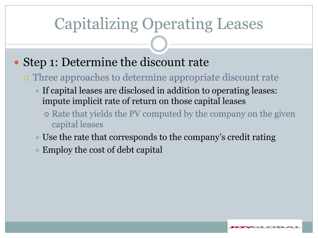 Capitalizing Operating Leases • Joy Global Step 1: Determine the discount rate • No capital leases to impute implicit rate of return • No recent borrowings • Last issue was 10/6/2011 • Use rate computed for cost of debt– 4.93% • BBB, so high rate makes sense!