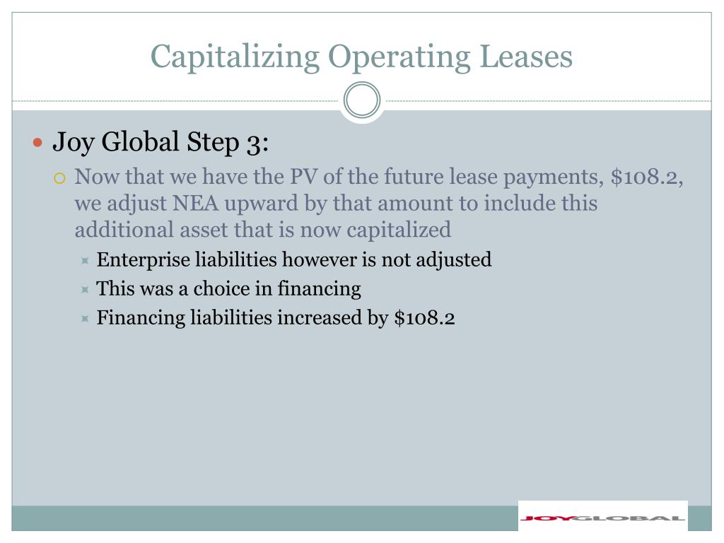 Capitalizing Operating Leases • Joy Global Step 3: • Now that we have the PV of the future lease payments, $108.2, we adjust NEA upward by that amount to include this additional asset that is now capitalized • Enterprise liabilities however is not adjusted • This was a choice in financing • Financing liabilities increased by $108.2