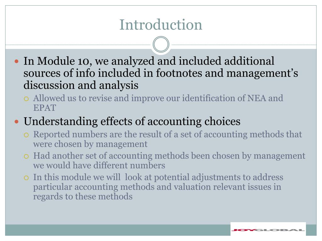 Introduction • In Module 10, we analyzed and included additional sources of info included in footnotes and management’s discussion and analysis • Allowed us to revise and improve our identification of NEA and EPAT • Understanding effects of accounting choices • Reported numbers are the result of a set of accounting methods that were chosen by management • Had another set of accounting methods been chosen by management we would have different numbers • In this module we will look at potential adjustments to address particular accounting methods and valuation relevant issues in regards to these methods