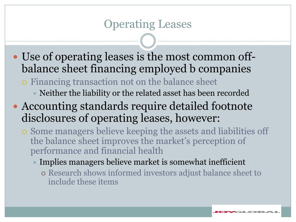 Operating Leases • Use of operating leases is the most common off-balance sheet financing employed b companies • Financing transaction not on the balance sheet • Neither the liability or the related asset has been recorded • Accounting standards require detailed footnote disclosures of operating leases, however: • Some managers believe keeping the assets and liabilities off the balance sheet improves the market’s perception of performance and financial health • Implies managers believe market is somewhat inefficient • Research shows informed investors adjust balance sheet to include these items