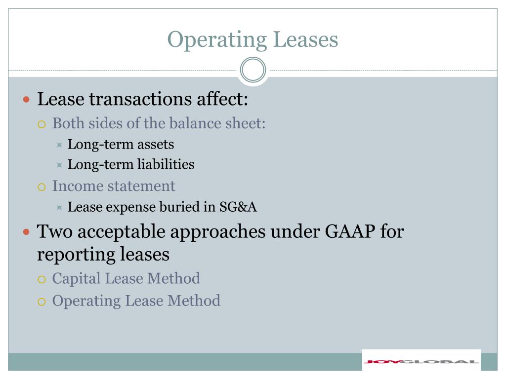 Operating Leases • Lease transactions affect: • Both sides of the balance sheet: • Long-term assets • Long-term liabilities • Income statement • Lease expense buried in SG&A • Two acceptable approaches under GAAP for reporting leases • Capital Lease Method • Operating Lease Method