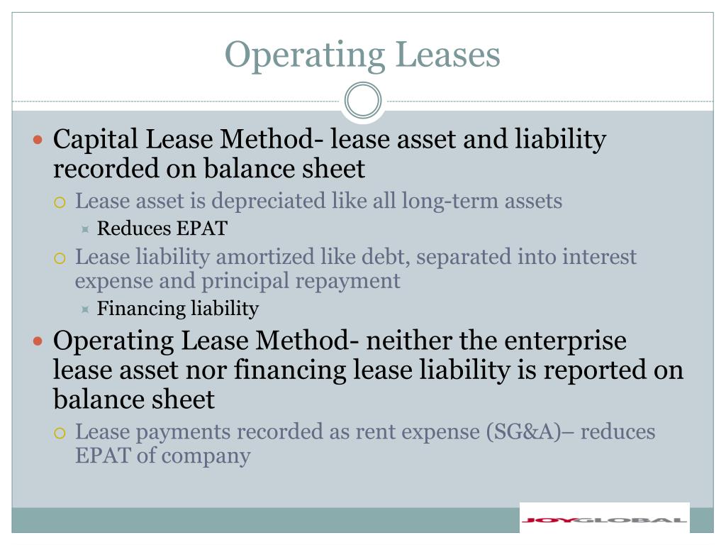 Operating Leases • Capital Lease Method- lease asset and liability recorded on balance sheet • Lease asset is depreciated like all long-term assets • Reduces EPAT • Lease liability amortized like debt, separated into interest expense and principal repayment • Financing liability • Operating Lease Method- neither the enterprise lease asset nor financing lease liability is reported on balance sheet • Lease payments recorded as rent expense (SG&A)– reduces EPAT of company