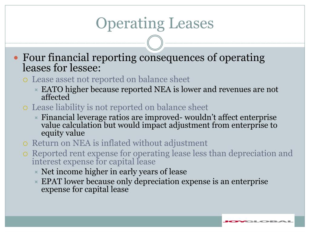 Operating Leases • Four financial reporting consequences of operating leases for lessee: • Lease asset not reported on balance sheet • EATO higher because reported NEA is lower and revenues are not affected • Lease liability is not reported on balance sheet • Financial leverage ratios are improved- wouldn’t affect enterprise value calculation but would impact adjustment from enterprise to equity value • Return on NEA is inflated without adjustment • Reported rent expense for operating lease less than depreciation and interest expense for capital lease • Net income higher in early years of lease • EPAT lower because only depreciation expense is an enterprise expense for capital lease