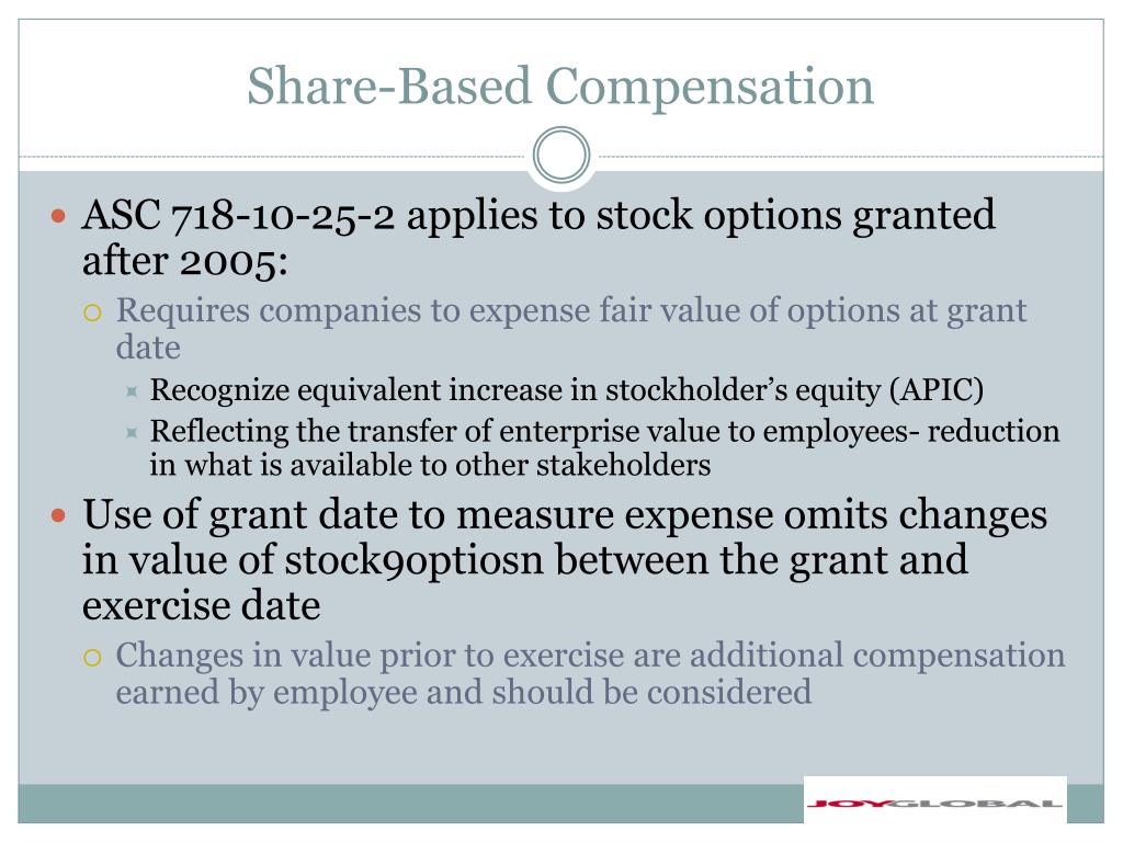 Share-Based Compensation • ASC 718-10-25-2 applies to stock options granted after 2005: • Requires companies to expense fair value of options at grant date • Recognize equivalent increase in stockholder’s equity (APIC) • Reflecting the transfer of enterprise value to employees- reduction in what is available to other stakeholders • Use of grant date to measure expense omits changes in value of stock9optiosn between the grant and exercise date • Changes in value prior to exercise are additional compensation earned by employee and should be considered