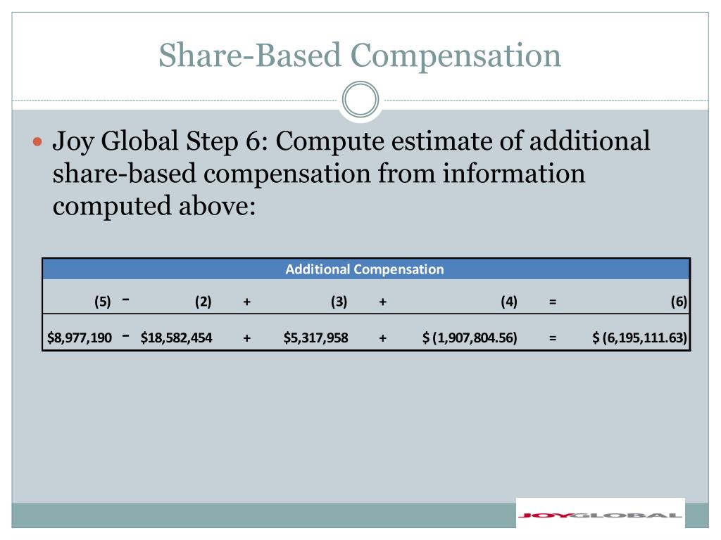 Share-Based Compensation • Joy Global Step 6: Compute estimate of additional share-based compensation from information computed above: