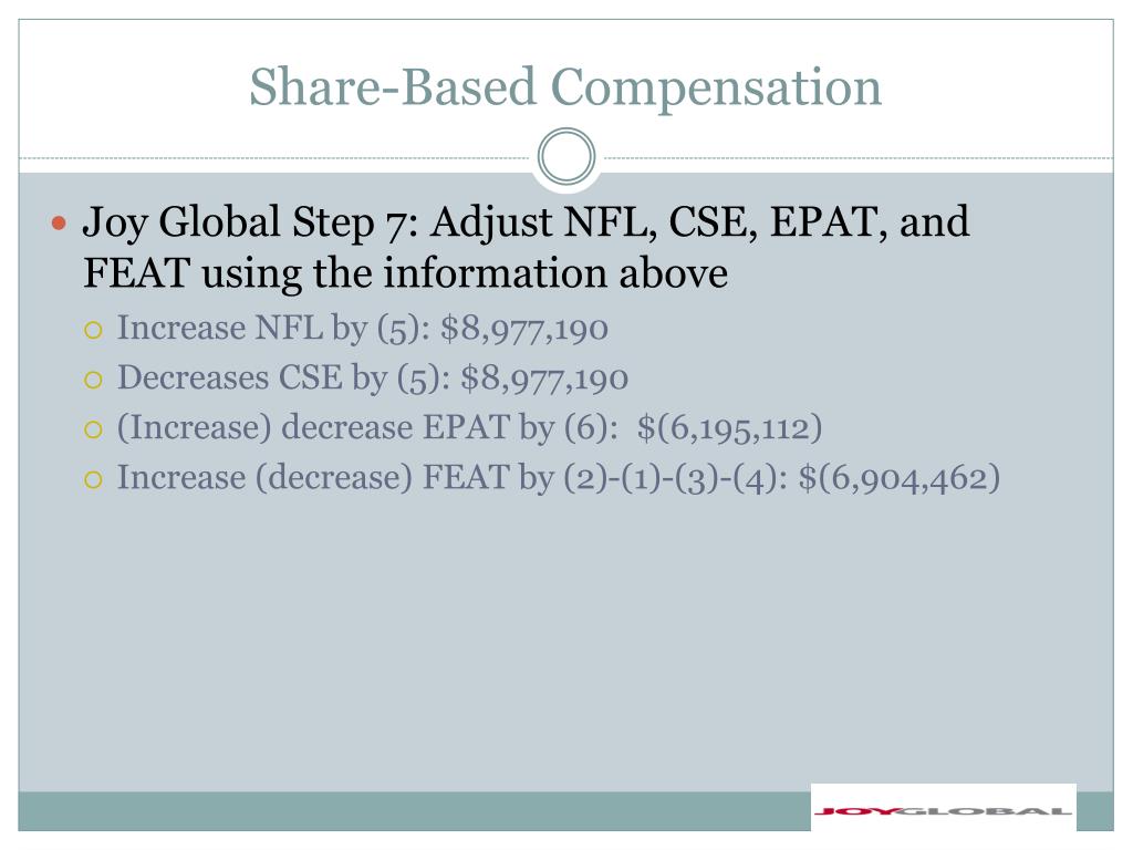 Share-Based Compensation • Joy Global Step 7: Adjust NFL, CSE, EPAT, and FEAT using the information above • Increase NFL by (5): $8,977,190 • Decreases CSE by (5): $8,977,190 • (Increase) decrease EPAT by (6): $(6,195,112) • Increase (decrease) FEAT by (2)-(1)-(3)-(4): $(6,904,462)