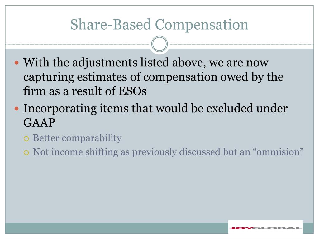 Share-Based Compensation • With the adjustments listed above, we are now capturing estimates of compensation owed by the firm as a result of ESOs • Incorporating items that would be excluded under GAAP • Better comparability • Not income shifting as previously discussed but an “ommision”