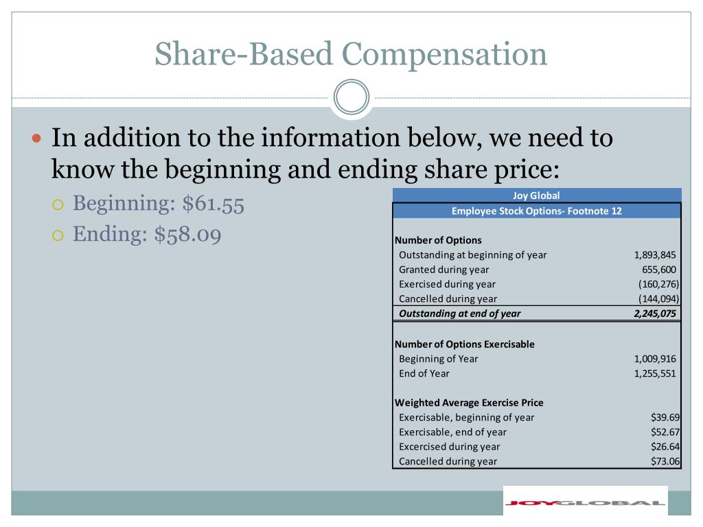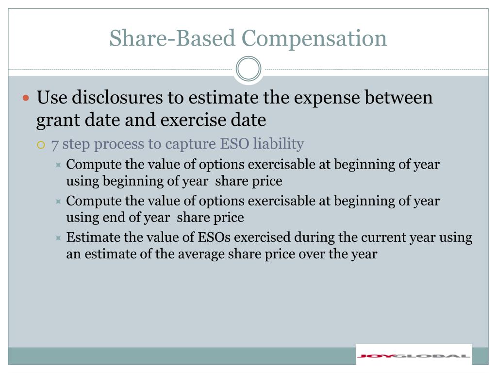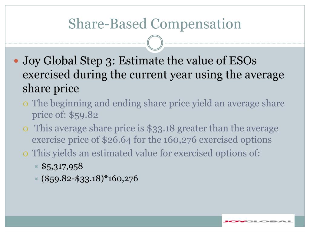 Share-Based Compensation • Joy Global Step 3: Estimate the value of ESOs exercised during the current year using the average share price • The beginning and ending share price yield an average share price of: $59.82 • This average share price is $33.18 greater than the average exercise price of $26.64 for the 160,276 exercised options • This yields an estimated value for exercised options of: • $5,317,958 • ($59.82-$33.18)*160,276