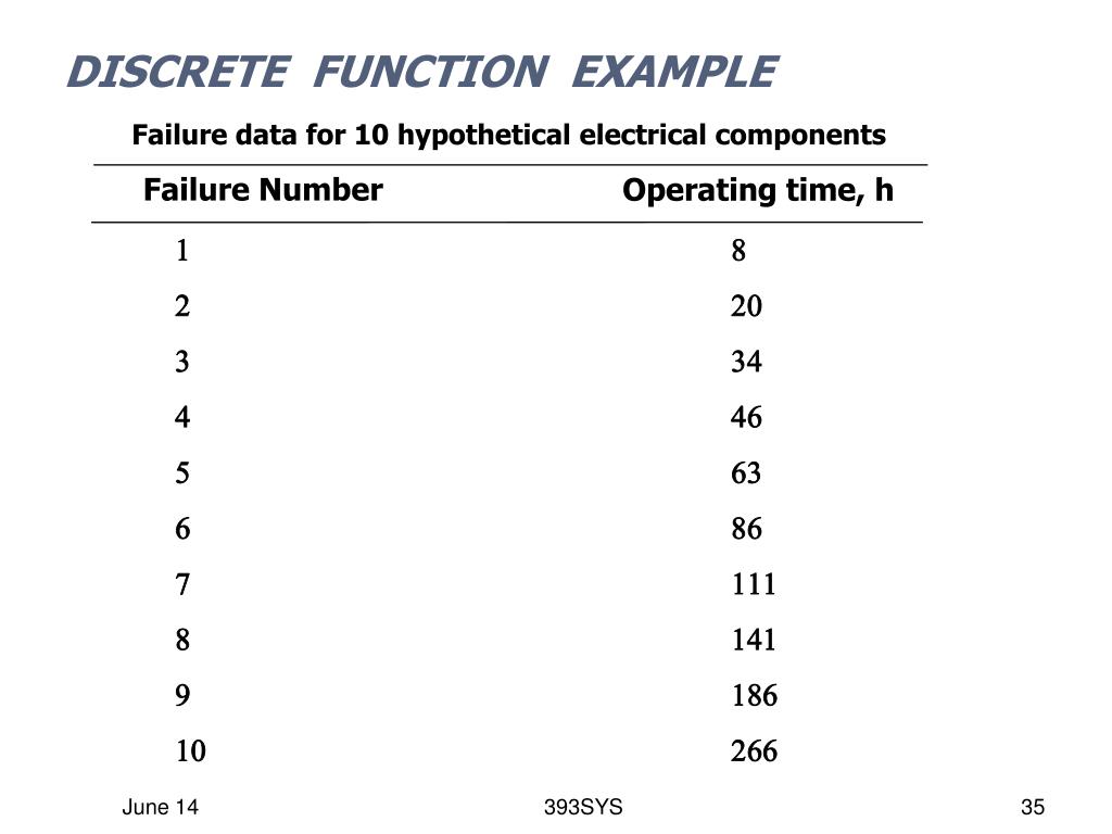 DISCRETE FUNCTION EXAMPLE Failure data for 10 hypothetical electrical components Failure Number Operating time, h 1 8 2 20 3 34 4 46 5 63 6 86 7 111 8 141 9 186 10 266 393SYS