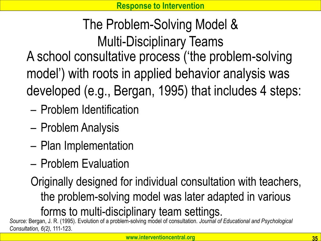 The Problem-Solving Model & Multi-Disciplinary Teams A school consultative process (‘the problem-solving model’) with roots in applied behavior analysis was developed (e.g., Bergan, 1995) that includes 4 steps: • Problem Identification • Problem Analysis • Plan Implementation • Problem Evaluation Originally designed for individual consultation with teachers, the problem-solving model was later adapted in various forms to multi-disciplinary team settings. Source: Bergan, J. R. (1995). Evolution of a problem-solving model of consultation. Journal of Educational and Psychological Consultation, 6(2), 111-123.