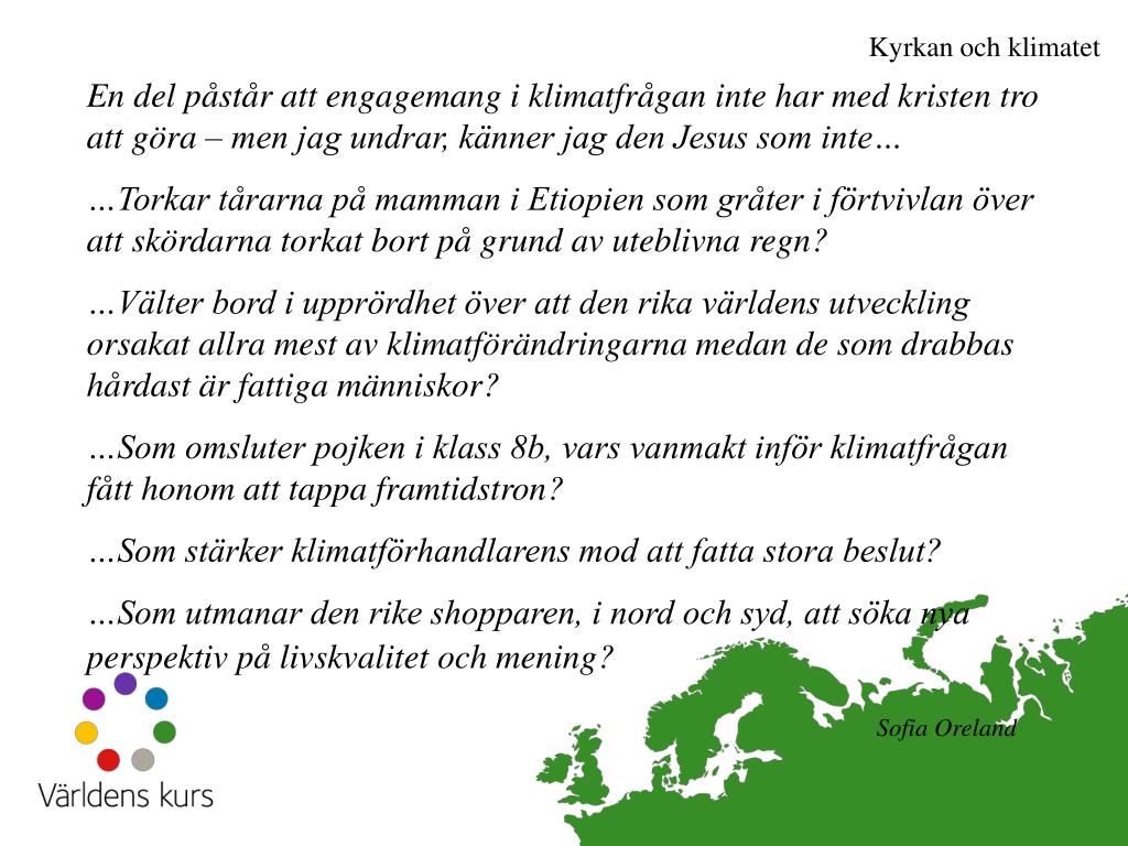 Kyrkan och klimatet En del påstår att engagemang i klimatfrågan inte har med kristen tro att göra – men jag undrar, känner jag den Jesus som inte… …Torkar tårarna på mamman i Etiopien som gråter i förtvivlan över att skördarna torkat bort på grund av uteblivna regn? …Välter bord i upprördhet över att den rika världens utveckling orsakat allra mest av klimatförändringarna medan de som drabbas hårdast är fattiga människor? …Som omsluter pojken i klass 8b, vars vanmakt inför klimatfrågan fått honom att tappa framtidstron? …Som stärker klimatförhandlarens mod att fatta stora beslut? …Som utmanar den rike shopparen, i nord och syd, att söka nya perspektiv på livskvalitet och mening? Sofia Oreland