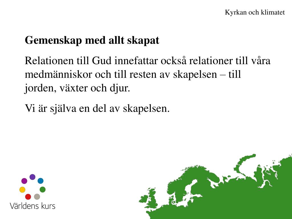 Kyrkan och klimatet Gemenskap med allt skapat Relationen till Gud innefattar också relationer till våra medmänniskor och till resten av skapelsen – till jorden, växter och djur. Vi är själva en del av skapelsen.