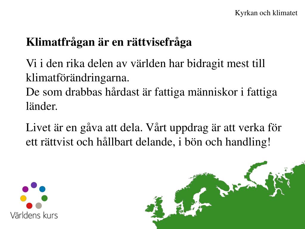 Kyrkan och klimatet Klimatfrågan är en rättvisefråga Vi i den rika delen av världen har bidragit mest till klimatförändringarna. De som drabbas hårdast är fattiga människor i fattiga länder. Livet är en gåva att dela. Vårt uppdrag är att verka för ett rättvist och hållbart delande, i bön och handling!
