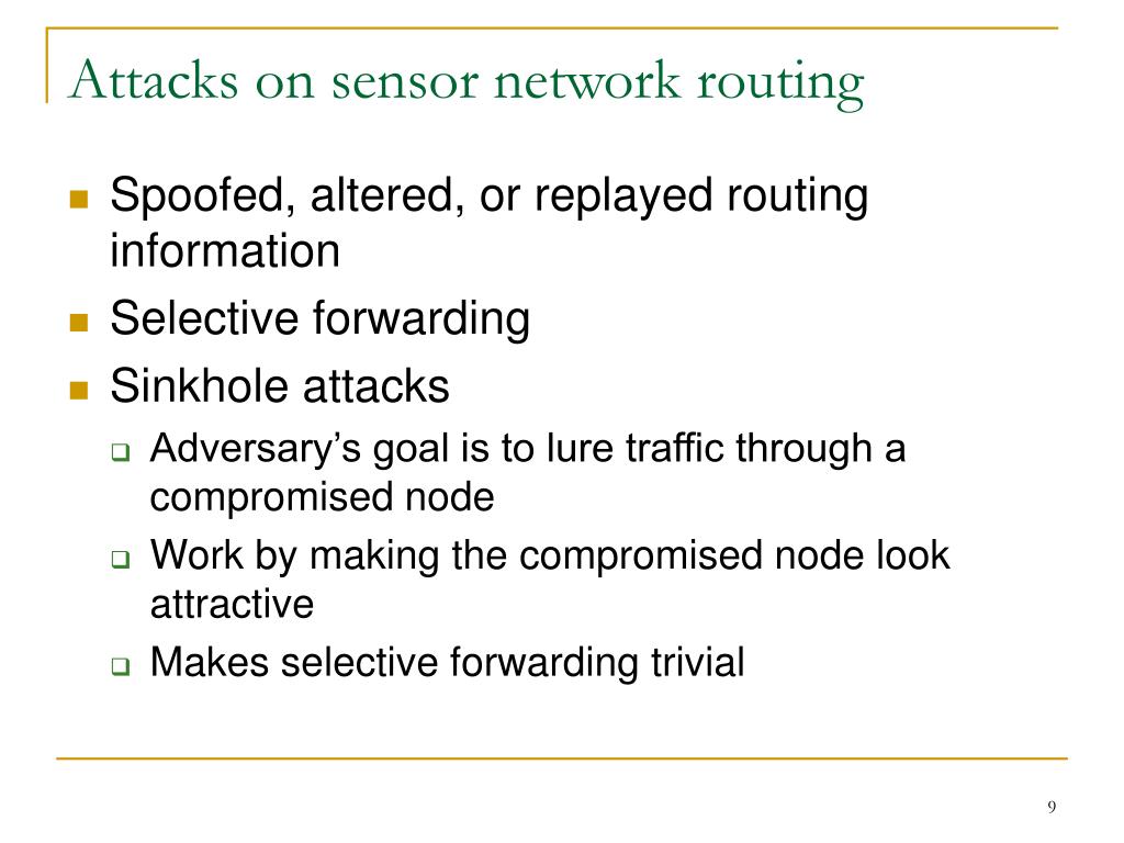 Attacks on sensor network routing • Spoofed, altered, or replayed routing information • Selective forwarding • Sinkhole attacks • Adversary’s goal is to lure traffic through a compromised node • Work by making the compromised node look attractive • Makes selective forwarding trivial