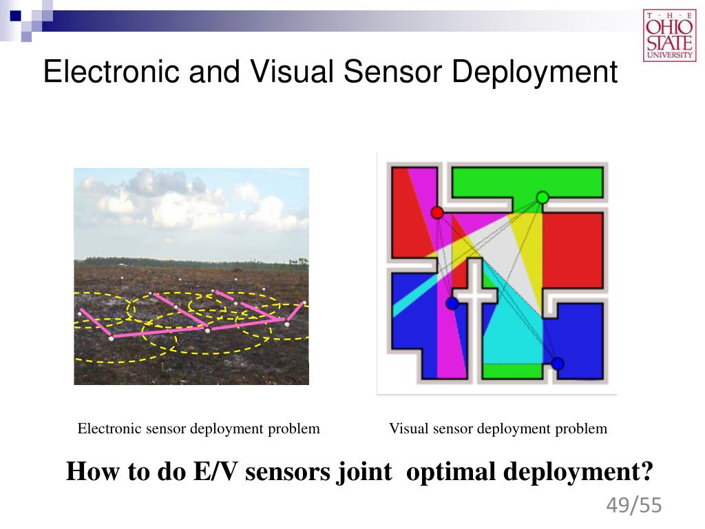 Electronic and Visual Sensor Deployment Electronic sensor deployment problem Visual sensor deployment problem How to do E/V sensors joint optimal deployment? 49/55