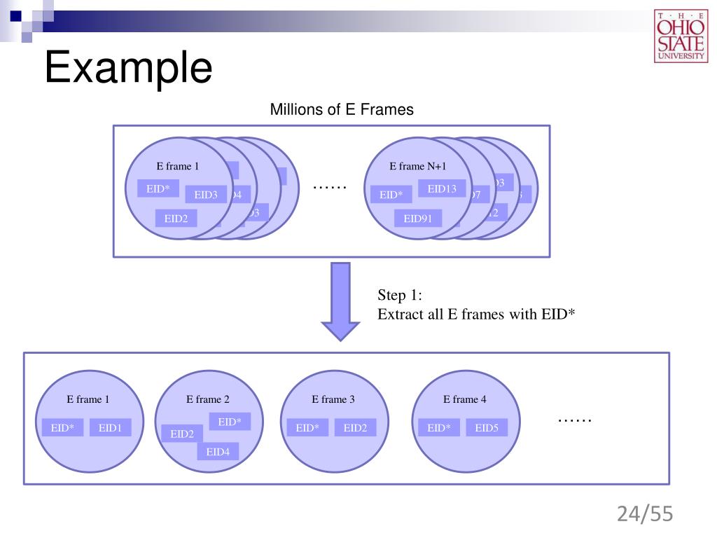 Example Millions of E Frames E frame N+1 E frame 1 E frame 1 E frame 1 E frame 1 E frame 4 E frame 1 E frame 3 E frame 1 E frame 1 E frame 1 E frame 2 E frame 1 EID4 EID3 EID3 EID* EID* EID* EID* EID* EID* EID* EID* EID13 EID* EID* EID* EID* EID* EID2 EID1 EID5 EID3 EID7 EID3 EID4 EID3 EID2 …… EID12 EID3 EID91 EID2 EID2 EID2 EID2 EID2 EID2 EID2 EID4 Step 1: Extract all E frames with EID* …… 24/55