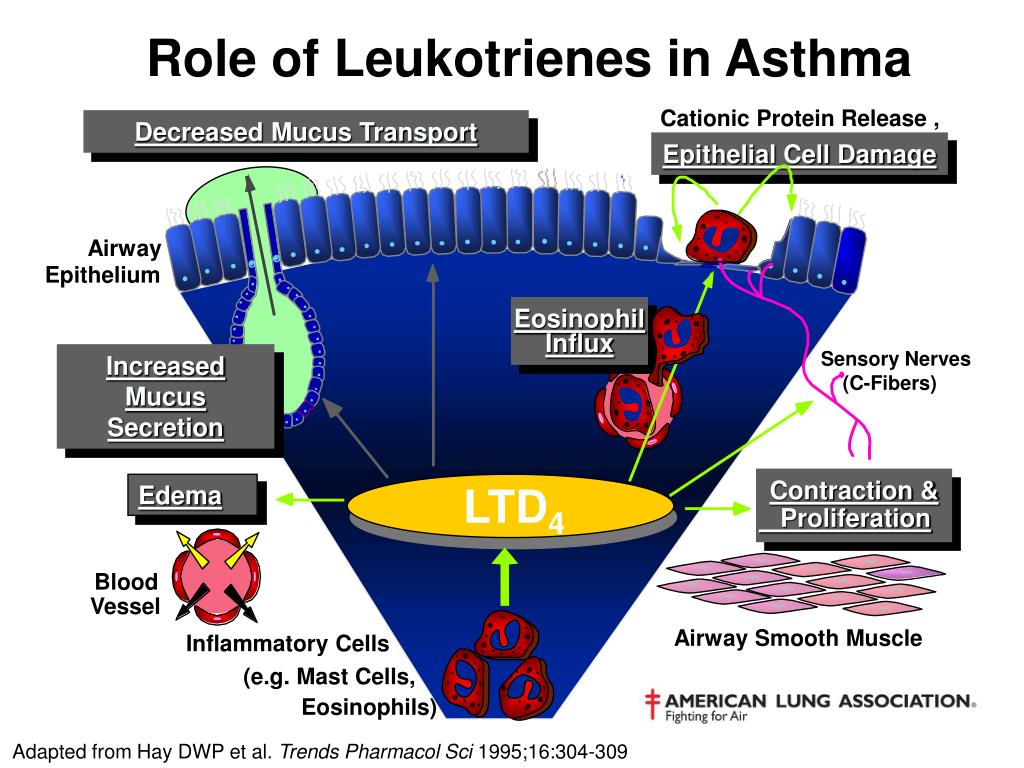 Cationic Protein Release , Decreased Mucus Transport Mucus Transport Epithelial Cell Damage Airway Epithelium Eosinophil Influx Sensory Nerves Increased Mucus Secretion (C-Fibers) Contraction & LTD4 Edema Proliferation Blood Vessel Airway Smooth Muscle Inflammatory Cells (e.g. Mast Cells, Eosinophils) Role of Leukotrienes in Asthma Adapted from Hay DWP et al. Trends Pharmacol Sci 1995;16:304-309