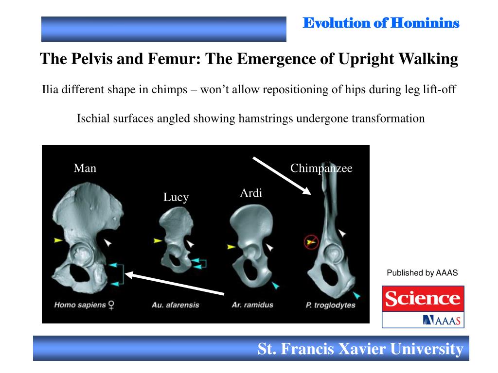 Evolution of Hominins The Pelvis and Femur: The Emergence of Upright Walking Ilia different shape in chimps – won’t allow repositioning of hips during leg lift-off Ischial surfaces angled showing hamstrings undergone transformation Man Chimpanzee Ardi Lucy Published by AAAS St. Francis Xavier University