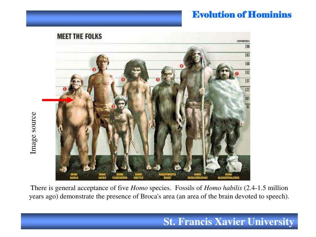 Evolution of Hominins Image source There is general acceptance of five Homo species. Fossils of Homohabilis (2.4-1.5 million years ago) demonstrate the presence of Broca's area (an area of the brain devoted to speech). St. Francis Xavier University
