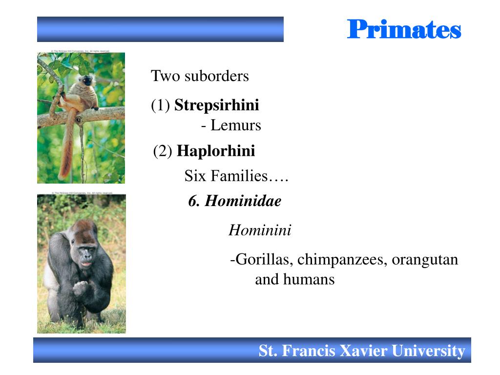 Primates Two suborders (1) Strepsirhini - Lemurs (2) Haplorhini Six Families…. 6. Hominidae Hominini -Gorillas, chimpanzees, orangutan and humans St. Francis Xavier University