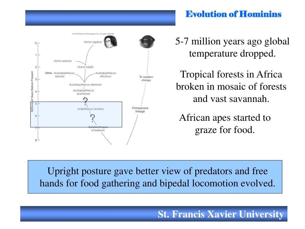 Evolution of Hominins 5-7 million years ago global temperature dropped. Tropical forests in Africa broken in mosaic of forests and vast savannah. African apes started to graze for food. Upright posture gave better view of predators and free hands for food gathering and bipedal locomotion evolved. St. Francis Xavier University