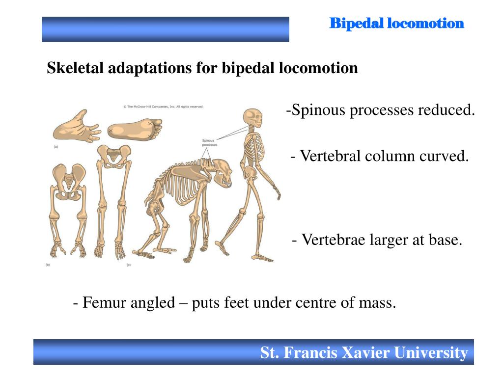 Bipedal locomotion Skeletal adaptations for bipedal locomotion -Spinous processes reduced. - Vertebral column curved. - Vertebrae larger at base. - Femur angled – puts feet under centre of mass. St. Francis Xavier University