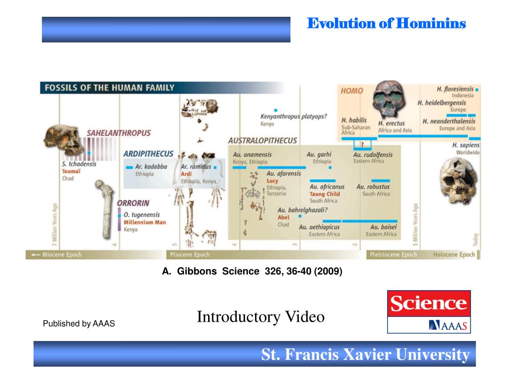Evolution of Hominins A. Gibbons Science 326, 36-40 (2009) Introductory Video Published by AAAS St. Francis Xavier University