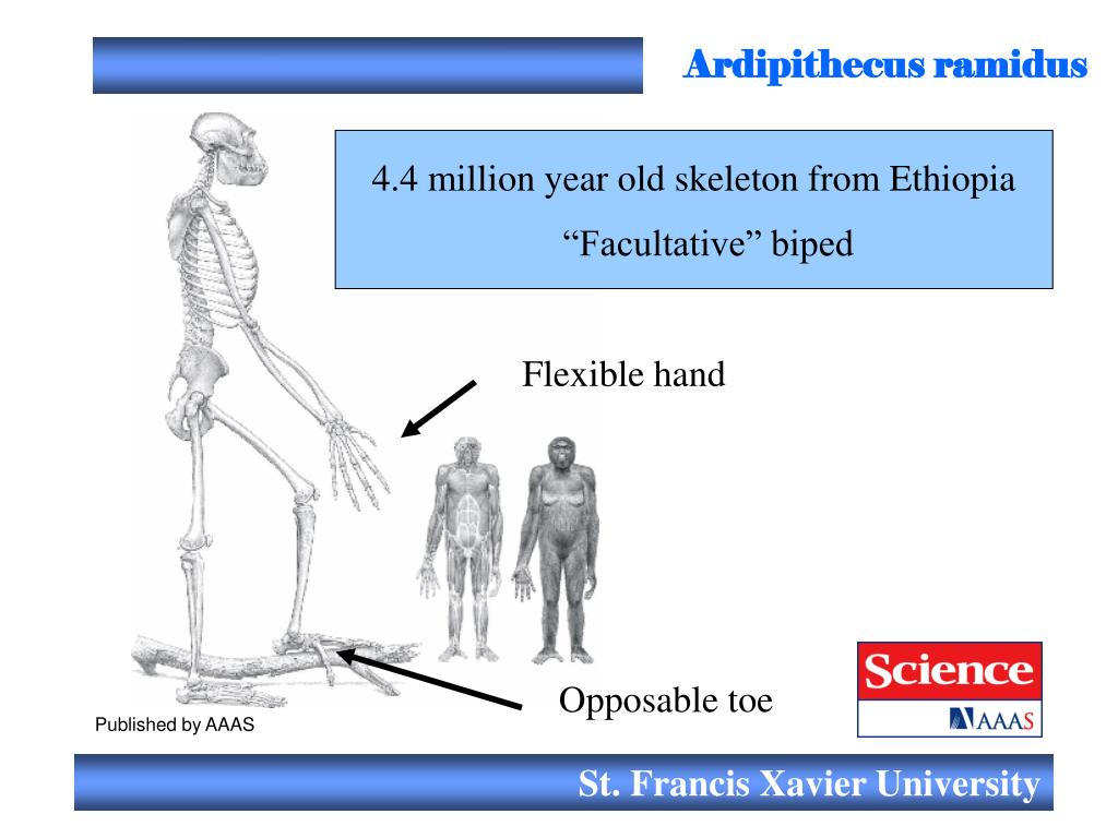 Ardipithecus ramidus 4.4 million year old skeleton from Ethiopia “Facultative” biped Flexible hand Opposable toe Published by AAAS St. Francis Xavier University